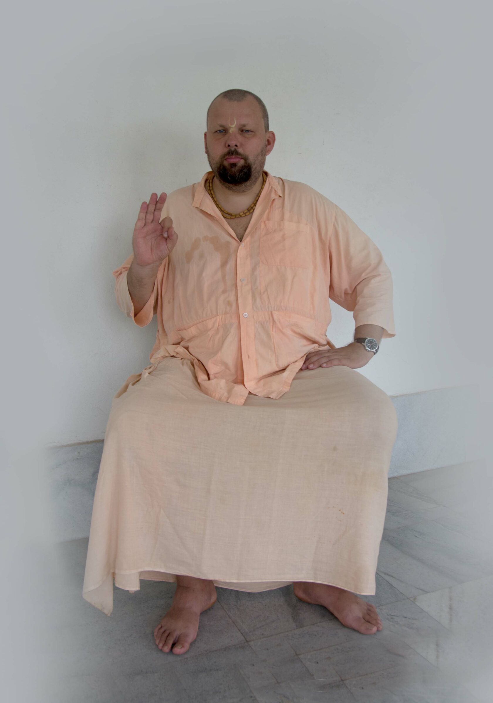 Нам не дано прямое общение с Прекрасным Абсолютом, однако мы имеем уникальную удачу и счастье пытаться служить Уджджвала Ниламани посредством абсолютного сверхпроводника, божественной артерии Кришна-сознания — Шри Рупануга Гуру-варги. Дорогой Шри Гурудев, Вы являетесь возлюбленным сыном Гуру-парампары. Вы благословлены и окружены нежной заботой непосредственных служанок Шри Рупы манджари и Шримати Радхарани, ярчайшими представителями милости Шри Нитьянанды Прабху и Шри Чайтаньядева. Поток Божественной Любви в Ваших откровениях являет неопровержимые доказательства реальности Мира Гармонии, Красоты, Махабхавы. Без живительного нектара Ваших лотосных стоп у нас нет шансов на спасение, мы обречены дремать на коленях злой ведьмы Майи, нет возможности вырваться из этой глубокой летаргии: пракрити представляет нам все новые и все более изощренные формы вечного невежества, бесконечных страданий. Единственный шанс у баддха-джив — принять всем сердцем Харинам-Санкиртану Шри Махапрабху. Для этих несчастных Вы, дорогой Гурудев, являетесь единственным спасением, т. к. Вы непосредственный участник этой с каждым мгновением нарастающей Лилы Прекрасной Реальности. Мы видим это в глубинах Ваших трансцендентных наставлений, это проявляется в Ваших любящих учениках. Ваша божественная миссия воплощается в Ваших прекрасных последователях. К сожалению, из-за своей ограниченности мы не имеем возможности общения со многими из Ваших учеников, но даже качества тех, с кем нам посчастливилось общаться, свидетельствуют о Вашей величайшей милости. Каждый из Ваших учеников для нас является примером преданности Миссии Шрилы Шридхара Махараджа, неиссякаемым источником веры, любви, служения Шри Чайтанье Махапрабху, С их помощью под Вашим руководством мы учимся смотреть на все под углом зрения Шри Гуру. Каждый свой поступок, слово, мысль мы стараемся предлагать Гуру, сознательно следовать важнейшему для нас принципу шаранагати — принимать все то, что развивает тягу к служению Вайшнавам и Гуру и отвергать все то, что препятствует этому. Так мы постепенно обретаем способность во всех явлениях, сопутствующих нашей жизни, видеть вдохновляющие и оберегающие наставления Шри Гуру, Вайшнавов, Шри Шри Радха-Говинды.