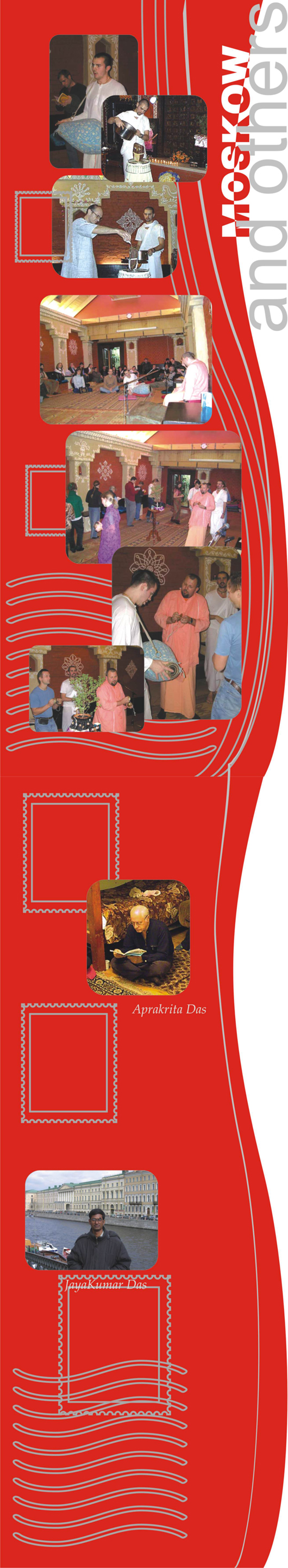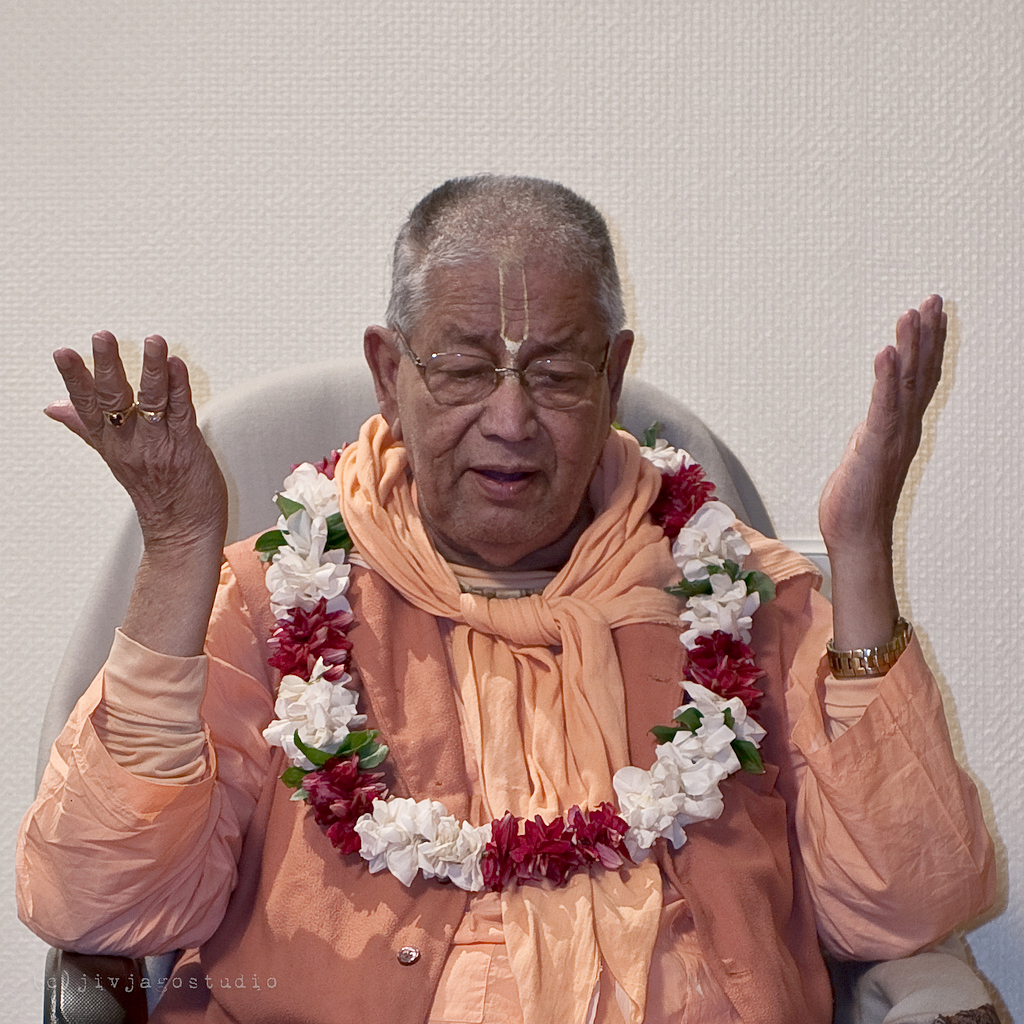 Из Вашего открытого сердца неиссякаемым золотым потоком вырывается Вулкан Божественной Любви. Вашей беспричинной милостью и надеждой в Москву и Санкт-Петербург низошел сам Верховный Господь в трансцендентной форме Шри Виграхи — великолепные Божества Шри Гирирадж Махарадж и Шри Шри Гуру-Гауранга-Радха-Мадхавасундарджиу. Но мы очень несчастны: наши слепые глаза и глухие уши лишены возможности воспринимать Абсолютную Реальность как в форме Имени, так и в форме Божества. Для нас, тонущих в океане обусловленности, единственная надежда — на спасительную лодку Ваших наставлений (адхокшаджа) и на помощь божественных посланников — Ваших учеников. Многие Ваши последователи, прежде всего, российские лидеры Шрипад Б. Б. Авадхут Махарадж, Шрипад Б. Ч. Бхарати Махарадж и Шрипад Виджай Раман Прабху, претворяют в жизнь указания Шри Чайтаньи Махапрабху: «этадавадж джанма-сапхальям дехинам иха-дехишу пранаир артхаир дхия вача шрея-ачаранам сада» (Ч.-ч., Ади, 9.42) — «Долг каждого живого существа — действовать на благо других своей жизнью, имуществом, разумом и речью».