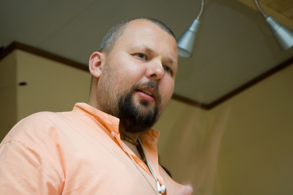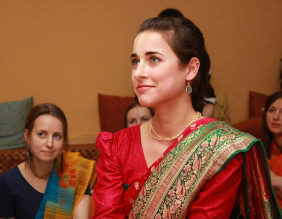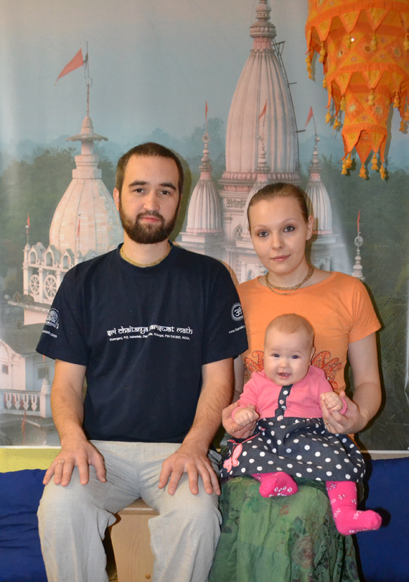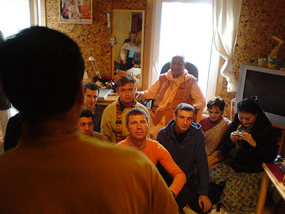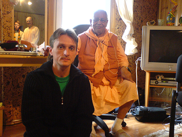 Прошло три месяца. Я вышла в общежитии на кухню поставить чайник, чтобы попить чайку, и встретила знакомую, которая сказала: «Ко мне папа приехал». Я говорю: «Круто. А я вот чай буду пить». А она говорит: «Пошли с нами пить чай». Прихожу. Там сидит её папа (сейчас Яшода Нандан Прабху), наматывает шикху на палец и отвечает на вопросы ещё пары моих друзей. Я присела, оказалось очень интересно то, что он говорит. Меня угостили сладкими шариками, и мы проговорили до четырёх утра. Оказалось, что он в то время был пуджари в храме ISKCON в Цюрихе и уже читал книги Шрилы Шридхара Махараджа. Всё, что он говорил, настолько резонировало с тем, что я искала, что я была в полном шоке. Всё вдруг встало на свои места. Ну, почти всё. То, что было сказано тем вечером, осознавалось постепенно.