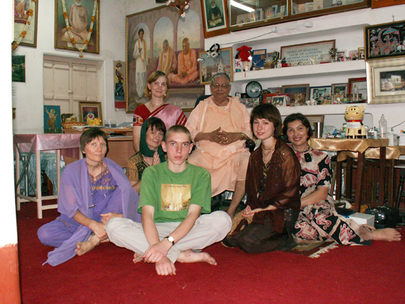 За зиму мне пришлось расстаться с прежней работой, чтобы дописать долго тянущийся диплом-диссертацию, и накопив небольшую сумму, подрабатывая официанткой и разнося пиво и мясо, я отправилась на Гаура-Пурниму и в паломничество вместе с преданными. В Калькуте, вскочив буквально «в последний поезд», мне повезло в первый и последний раз увидеть Гурудева. Всего несколько минут по приезду в Калькуту и потом всего несколько минут перед нашим отправлением в Россию, Гурудев дважды дал нам возможность встречи с ним.