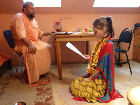 Вернувшись в Киев осенью 2012 года, я попала в круговорот живой постоянно новой проповеди. Изменилось всё. Я практически жила в студии, где пыталась быть полезной преданным. Приехал Шрила Авадхут Махарадж – и я поняла, что у меня есть семья. Приехал Шрила Госвами Махарадж, и я поняла, что у меня есть прибежище. Я никогда и нигде ещё ранее не ощущала себя настолько «дома», как с ними. Я поняла, что теперь я в безопасности. Шрила Госвами Махарадж получил вдохновение от Шрилы Гурудева поменять мне имя Махамайя Д.Д. на Йогамайя Д.Д. и дал шанс стать немного ближе к Гурудеву, милостиво дав второе посвящение.